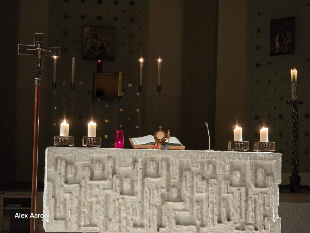 findest Du Dich da wieder? Mit Sicherheit. Das persönliche Gebet beinhaltet meine Wünsche, die ich an Gott direkt richte. Egal wo ich das tue. Die beiden folgenden Bilder zeigen anschaulich die Möglichkeit des persönlichen Gebets. Links in der Kirche – hier noch in einer besonderen Form der Anbetung des Allerheiligsten, des Brotes, in der Jesus Christus während der Wandlung seines Körpers in lebendiges Brot – und rechts irgendwo in der Natur oder Wohnung. Die Darstellung zeigt hier Jesus Christus bei seinem Gebet im Garten Gethsemane, in dem er zu Gott dem Vater bittet.